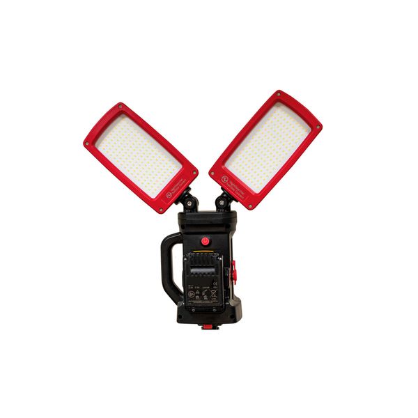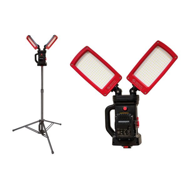 Højeffektiv arbejdslampe med to 360° roterende lampehoveder til de mest almindelige 18-21V værktøjsbatterier. Passer til f.eks. Makita, DeWalt, Milwaukee, Bosch, Stanley og Black&Decker-batterier. Justerbar lysstrøm, neutral 5000K farvetemperatur. Et praktisk stativ er også inkluderet! Angivet lysstrøm 12000 lm.