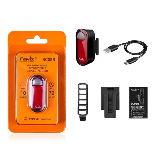 Fenix BC05R V2 er en effektiv rød baglygte til cykler, som også kan monteres på f.eks. en rygsæk og på en cykelsaddelbeslag. Det røde lys er synligt på op til 200 meter, så du kan se din cykel eller bevæge dig synligt rundt, f.eks. når du løber eller går. Denne lygte er genopladelig og oplades via en højhastigheds USB-C-opladningsport med høj hastighed og den nyeste teknologi. Det tager kun 1,5 time at lade den op fra tom til fuld opladning, og på en enkelt opladning kan BC05R V2 køre i op til 120 timer (5 lm / langsomt blink)! BC05R V2 er et godt valg for pendlercyklister, aktive cyklister, løbere, friluftsentusiaster og alle, der ønsker at cykle og være udendørs sikkert på alle årstider.