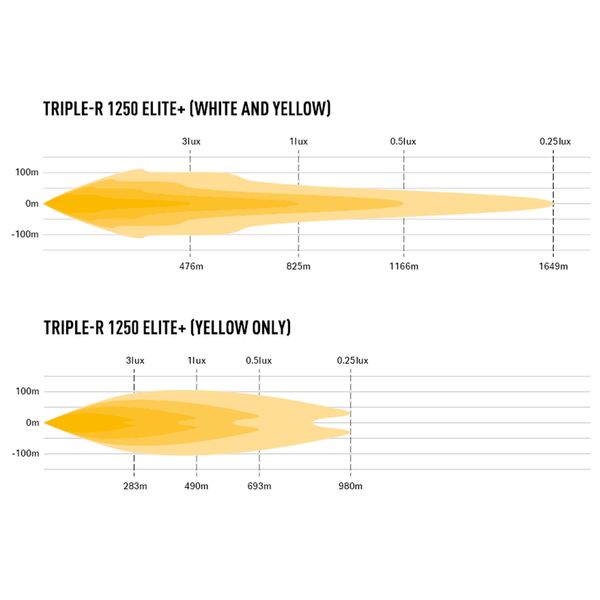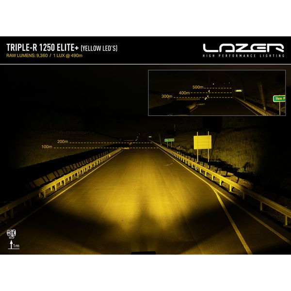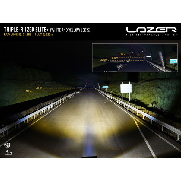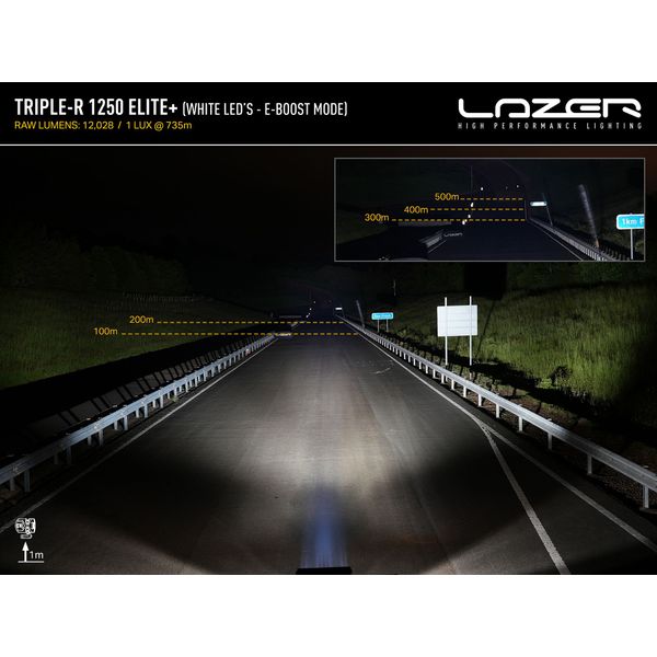 Lazer Triple-R 1250 Elite+ (Plus) er et fjernlys, der bruger den nyeste LED- og reflektorteknologi, og som også har et spektakulært parkeringslys, hvis farve kan indstilles til hvid eller stilfuld gul-orange. Ud over det hvide lys har fjernlyset også et gult lys til dårligt kørevejr. Triple-R 1250 Elite+ er et højtydende fjernlys med en punktlignende lysstråle, der er velegnet til både vej- og offroad-brug. Ifølge producenten har fjernlyset en lysstrøm på hele 12.028 lm med hvidt lys og 21.388 lm, når det hvide og gule lys er tændt samtidig (mere om denne funktion nedenfor). Med hvidt lys er rækkevidden 732 m (1 lux) (hvidt lys, boost-tilstand) og med begge lys tilsluttet hele 825 m (@ 1lux), hvilket er en fantastisk præstation for en rampe i denne størrelsesklasse. De diskrete designopdateringer og den nye, mørke optik, der dannes af et mørkt printkort, får rampen til at passe endnu bedre ind i fronten på moderne biler. Denne rampe har også den patenterede E-BOOST-teknologi, der gør det muligt at bruge fjernlyset med mindre effekt i vejtrafikken (E9) og med mere effekt uden for normal vejtrafik.