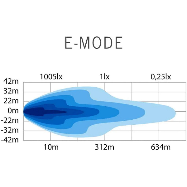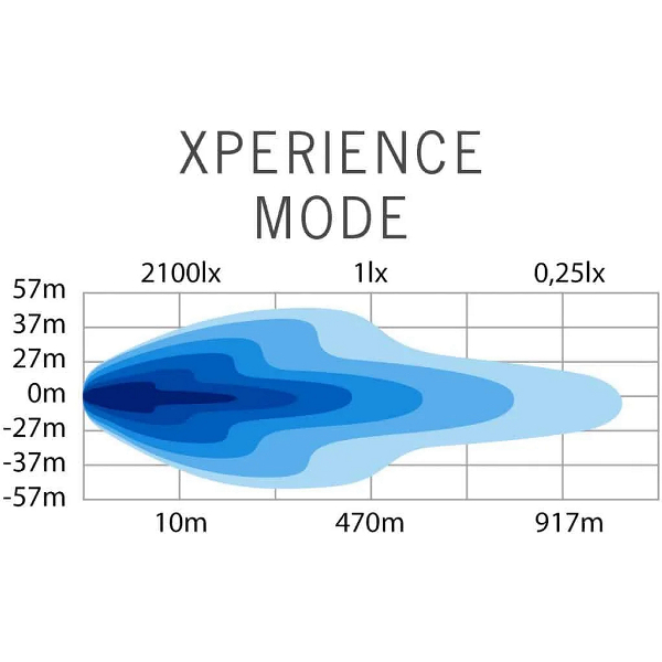 Ekstremt kraftig fjernlys designet til vanskelige forhold, udstyret med tofarvet parkeringslys og to forskellige strømindstillinger. Angivet maksimal lysflow på 22 900 lm, rækkevidde 470 m @ 1 lux.