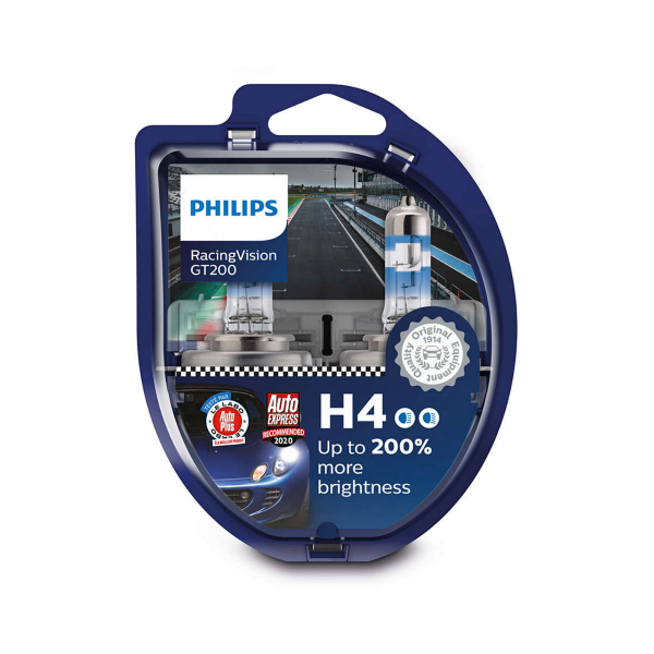 Philips RacingVision GT200 er et par kraftige halogenpærer med H4-sokkel, der giver op til 200 % stærkere og forbedret synlighed sammenlignet med bilens originale forlygter. Potentielle forhindringer og farer på og uden for vejen vil blive opdaget tidligere, hvilket forlænger din reaktionstid og dermed øger sikkerheden bag rattet. Producenten angiver en effekt på 60/55W og en farvetemperatur på 3600K. H4-basis.