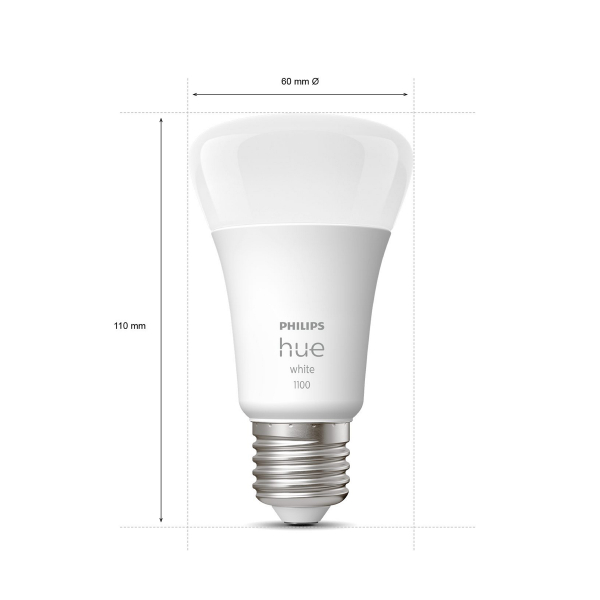 Med denne Philips Hue Hvid E27 LED-pæresæt kan du tilføje et smart belysningssystem til dit hjem. Pakken indeholder to E27-sokkel E27-pærer med varm hvid (2700K) LED-pærer og en Hue Bridge, som gør det nemt at styre den smarte belysning. De smarte pærer, som kan justeres via Philips Hue-appen, er gode til generel belysning og stemningsbelysning i hjemmet, og lysstyrken på de hvide pærer kan dæmpes trinløst direkte via din smartphone via Hue-appen, når de er forbundet med den medfølgende Hue Bridge. Med disse smarte LED-pærer kan stort set alle pærer med en E27-fatning gøres kompatible med Philips Hue-smart-systemet. På denne måde kan de forskellige smarte belysningsløsninger i hjemmet også implementeres med de lamper, der allerede findes i rummene. Philips Hue-pærene fungerer problemfrit sammen med smart tilbehør, f.eks. Hue-dæmperen eller Hue-smartknappen, og selvfølgelig kan lamperne også tændes og slukkes med en almindelig afbryder. I så fald husker pæren den sidste lysindstilling, den havde. Det er lige så nemt at installere en smart pære som at udskifte en almindelig pære. Når den smarte LED-pære er sat på plads i lampen, kan lyset justeres via appen. LED-pærens specificerede lysflow er 1100 lumen, farvetemperatur 2700 kelvin.