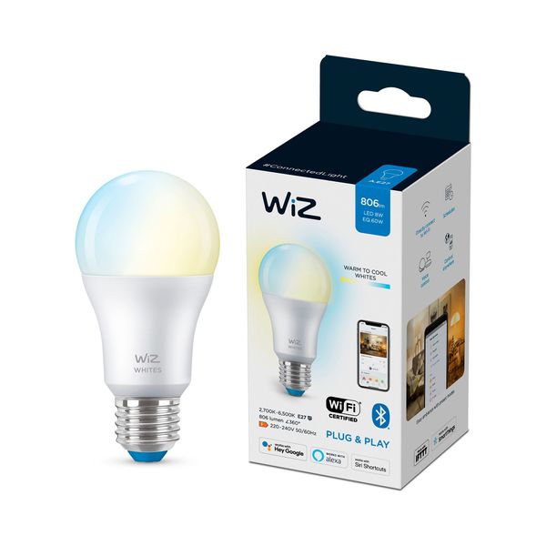Wiz White E27 er en smart LED-pære, som styres via. Wiz mobilappen, med en justerbar farvetemperatur på 2700 - 6500 K hvilket er perfekt til almen- og stemningsbelysning i alle rum i hjemmet. Wiz E27-pæren har færdige lysindstillinger til bl.a. koncentration og afslapning, men farvetemperaturen kan endda justeres trinløst med Wiz-appen. Find den intensitet og farvetemperatur som passer dit humør - fra afslappende varme toner til kolde hvide nuancer. Wiz White er kompatibel og fungerer trinløst med andre smarte tilbehør, såsom Wizmote fjernbetjening og bevægelsessensor. Den smarte LED-lampe kan tidsindstilles til at tænde og slukke via. appen efter dine rutiner, f.eks. når du går på arbejde. Kan købes individuelt eller i en pakke med to. Producenten angiver et lysflow på 806 lumen, farvetemperatur 2700 - 6500 Kelvin.