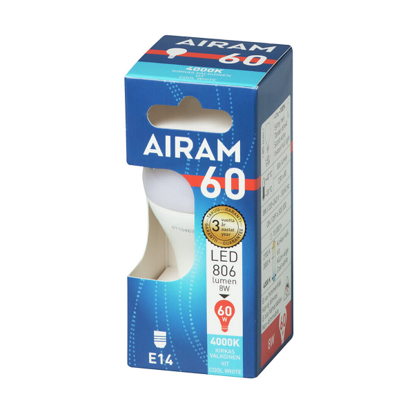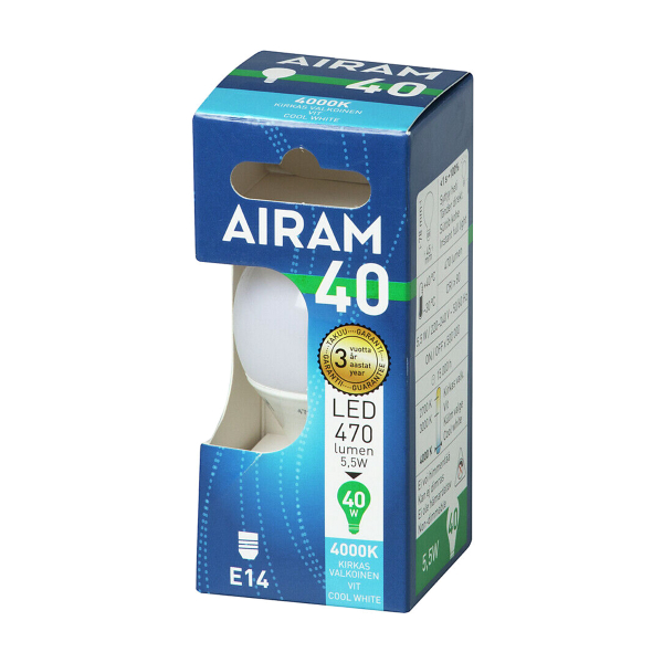 LED lampe med E14-sokkel fra Airam. Den opale lampe giver blændfrit lys og på grund af sit stilfulde design er pæren også velegnet til åbne armaturer. Tre års (36 måneder) garanti!