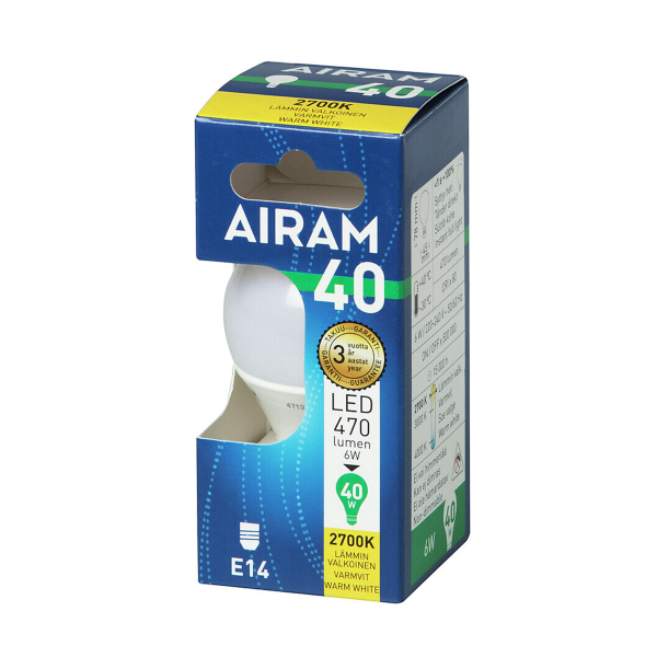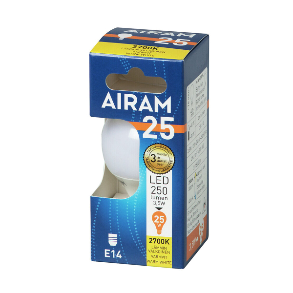 LED lampe med E14 sokkel. Farvetemperatur 2700K. Tre års garanti. Vælg mellem tre forskellige alternativer.