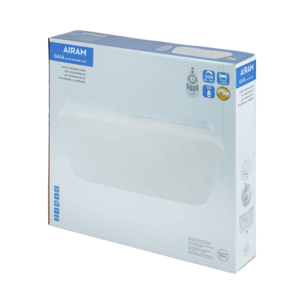 Airam Gaia Slim Square er en trendig og minimalistisk loftlampe, som afgiver et jævnt lys og er god til alle tørre rum i hjemmet. Farven på LED-lyset kan justeres trinløst fra en behagelig varme 2700 til lyse 6500 K med en brugervenlig fjernbetjening som endda fungerer som dæmper. Fjernbetjeningen har en mindefunktion som kan styre op til fire Gaia-lamper på samme tid. Lampen kan monteres direkte på tagudtaget med en lampesokkel og beslag alternativ med skruefæste på koblingsdåse. Specificeret lysflow på 1600 lumen og en farvetemperatur på 2700 - 6500 kelvin.
