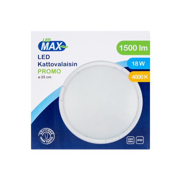 Led Energie Promo er en effektiv universallampe til tørre rum i hjemmet. Med sit tidsløse design og behagelige farvetemperatur passer lampen til en mængde forskellige rum. Producenten angiver et lysflow på 1500 lumen og en farvetemperatur på 4000 Kelvin. Armaturets diameter er 250 mm.