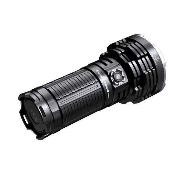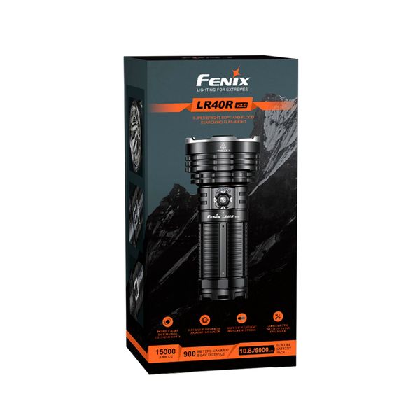 Fenix LR40R V2 er en meget kraftig genopladelig lommelygte, der er særligt velegnet til eftersøgnings- og redningsopgaver. LED'erne, der er placeret langs kanterne af lygtehovedet, er designet til bred belysning af det omgivende terræn og giver ifølge producenten en maksimal lysstrøm på op til 12.000 lumen. Dioderne til det fokuserede spotlight er placeret i midten af lampen og giver en maksimal lysstrøm på 3.000 lumen. Dioderne i midten af lampen producerer en meget intens og smal lysstråle med en rækkevidde på op til 886 meter. De forskellige stråler kan bruges enten sammen eller hver for sig, afhængigt af situationen. Når begge bruges samtidig, opnås en maksimal lysstrøm på 15.000 lumen og en rækkevidde på 900 meter. Lampen fungerer med et indbygget højkapacitetsbatteri (3 x 5000 mAh), som oplades problemfrit med det medfølgende USB-C-ladekabel. Derudover er lampen udstyret med en USB-A-udgang, hvilket betyder, at batteriet kan bruges som powerbank til at oplade f.eks. din mobiltelefon.