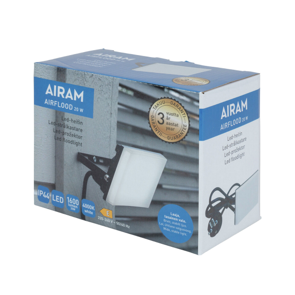 Airam Airflood er en moderne og let struktureret LED-lysmast, der er velegnet til belysning af gårdspladser, bygninger, gangarealer og endda parkeringspladser. Med sit kantløse design passer lysmasten elegant til facaden på forskellige bygninger, og frontpanelet giver et behageligt jævnt lys over hele overfladen. Takket være den justerbare lysvinkel kan lyset nemt rettes mod det ønskede sted. Alle lamper i Airflood-serien er støv- og vandtætte i henhold til IP44, hvilket betyder, at de kan modstå forskellige vejrforhold og frost og er velegnede til brug hele året rundt. Et gummikabel af høj kvalitet med stik gør tilslutningen let. Tre års garanti!