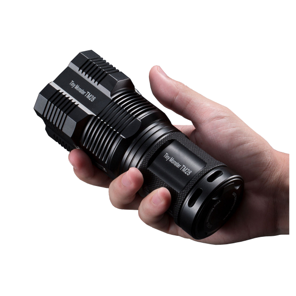 Nitecore "Tiny Monster" TM28 er en lommelygte, der lever op til sit kælenavn, da den har en enorm kraft med en lang rækkevidde. Lampens ydeevne ligger i de fire CREE XHP35 HI LED'er, som hver især er placeret i en dyb SMO-reflektor. Sammen med reflektorteknologien og de fire LED'er giver den et maksimalt lysflow på op til 6000 lumen og en vanvittig rækkevidde på 655 meter, hvilket er en imponerende bedrift for en lampe i denne størrelsesklasse! Lampen drives af fire 18650 Li-ion-batterier, der nemt kan oplades via lampens opladningsport. TM28 er også kompatibel og kan drives af 18650 IMR-batterier som strømkilde. Lampen er praktisk og velegnet til altid at være med dig takket være det medfølgende bæltehylster. Der medfølger også en praktisk håndledsrem for at forhindre, at lampen glider ud af hånden på dig. Lommelygten er designet til hårdt brug og er fuldt vandtæt i overensstemmelse med IPX8-beskyttelsesklassen, da den kan tåle kontinuerlig nedsænkning i op til 1 meter. Sammenfattende er TM28 et fremragende valg til krævende arbejde, søgning og hobbybrug.