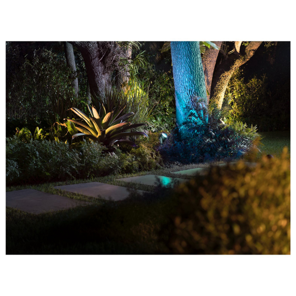 Et effektiv Philips Hue spotlys velegnet til udendørs brug, som kan styres med Philips Hue Bridge. Angivet lysflow 1060 lm, farvetemperatur 2000 - 6500 K, lysfarven er justerbar. IP65-klassificering.