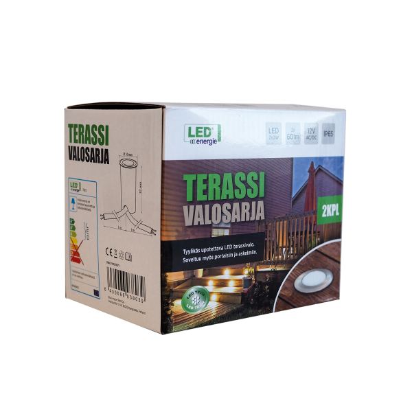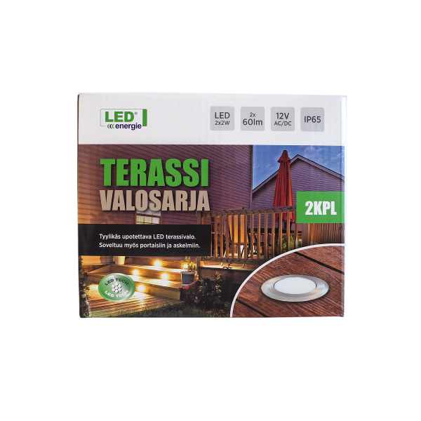 Led Energy's stilfulde indbyggede terrassebelysning, der er velegnet til belysning af terrasser, indgange og trapper. Pakken indeholder to lamper, et to meter langt kabel og en 22W-transformer. Hvis det ønskes, kan lyssættet udvides til 8 stk. med yderligere lamper, der sælges separat. Lampedelen er støv- og vandtæt i henhold til IP65-klassificering, og strømforsyningen har en IP44-klassificering. Specificeret lysflow på 2 x 60 lumen, farvetemperatur 3000 Kelvin.