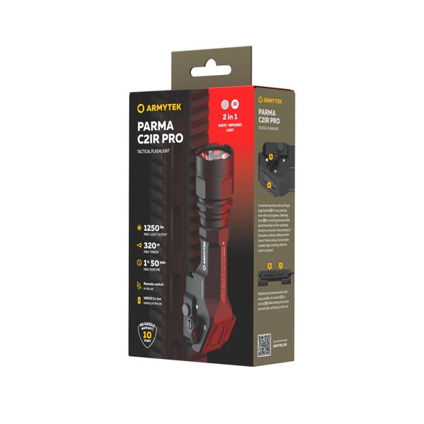 Armytek Parma C2IR Pro er en kraftfuld taktisk våbenlampe udstyret med et kraftigt spotlys, der når op til 320 meter, og en separat infrarød lysfunktion. Lampens kraftige LED og højtydende batteri giver en lysstrøm på 1250 lumen, som i kombination med en præcisionsbearbejdet glaslinse skaber et spotlys, der er optimalt for en våbenlampe. Derudover har lampen fire IR-lysdioder (infrarøde lysdioder), som er designet til brug med nattesynsbriller. Takket være det integrerede beslag kan lygten monteres på Picatinny- og Weaver-skinner uden ekstra værktøj, og det mindre design med lav profil betyder, at lygten næsten ikke stikker ud fra våbenets profil. Det lette design ændrer heller ikke våbenets balancepunkt væsentligt. Parma C2IR Pro er udstyret med en enkel brugergrænseflade, og alle funktioner kan betjenes med kun én finger. Desuden medfølger en fjernbetjening, så lampen kan betjenes fra forskellige pistolgreb. Parma C2IR Pro fungerer med enten et genopladeligt 18650-batteri eller to CR123A-batterier.