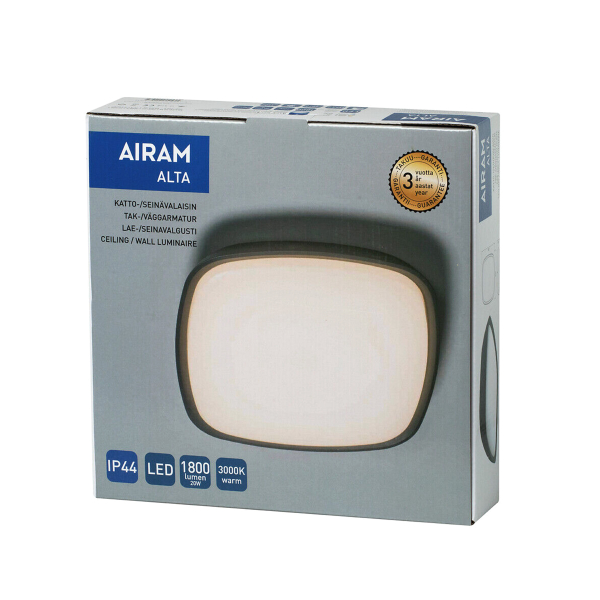 Airam Alta passer som væg- og loft monteret lampe til udendørs brug. Designet til montering på tag eller væg i entreer, terrasser, balkoner osv. Lampen er robust og solid og fremstillet af trykstøbt og pulverlakeret aluminium, som ikke bleges under påvirkning af sollys eller havklima. Specificeret lysflow på 1800 lumen, farvetemperatur på 3000 Kelvin.
