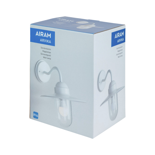 Airam Arvika er en traditionel væglampe med en armatur i stål og en stor kuppel i klart bobleglas, der udstråler nostalgi. Arvika er ideel til belysning af indgange, facader og gårdspladser. Lyskilden er tydeligt synlig inde i lampen, så valget af lyskilde kan have stor indflydelse på lampens udseende og den atmosfære, den skaber. Findes i hvid eller sort, lampe med E27 sokkel (maks. 60W) ikke inkluderet.
