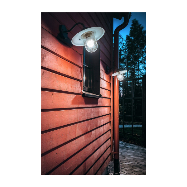 En traditionel væglampe, der er velegnet til belysning af f.eks. bygningsfacader eller indgange til gårdspladser. Findes i hvid eller sort, pære med E27 sokkel (ikke inkluderet).