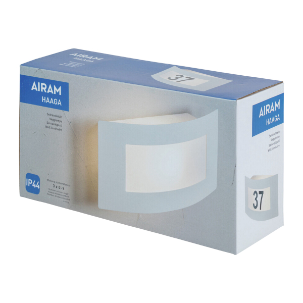 Airam Haaga er en god væglampe som både fungerer som almen belysning eller nummerbelysning til entreer og indgange til boligen. Takket være sit flotte design smelter lampen ind i husets facade og den kan anvendes til enkelt at vise husnummeret med de medfølgende nummer klistermærker (3 x 0-9). Lampen drives med en valgfrit E27 LED-lampe (medfølger ikke). Findes i hvid eller rustfrit stål.